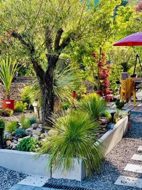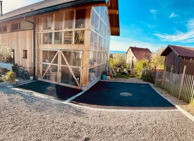 Votre entreprise de terrassement à Bon-en-Chablais a effectué des travaux chez un particulier: pose de goudron et de gravillons et aménagement de la cour ainsi que de l'entrée principale, nous avons également fait la création de jardins surélevés en béton.