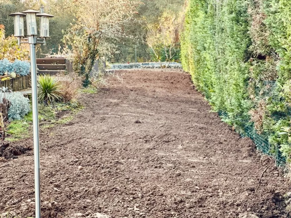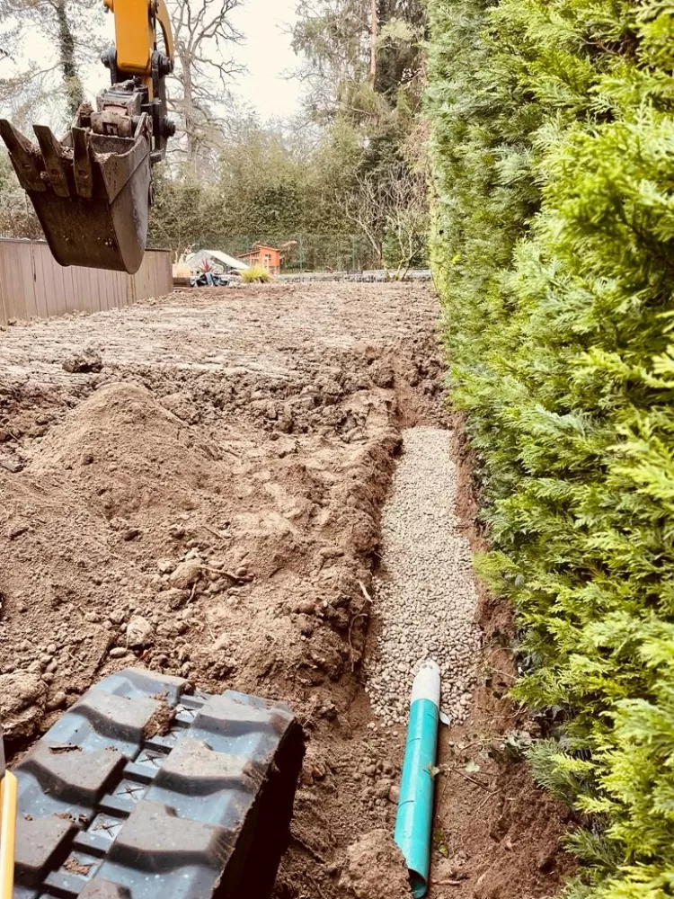 Modification terrain espace vert. Remise à niveau avec terre végétale et mise en place d'un tuyau de drainage à SCIEZ dans le domaine du coudrée.