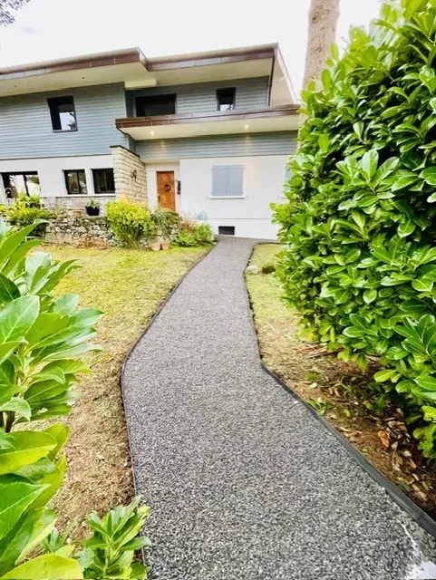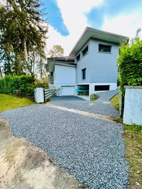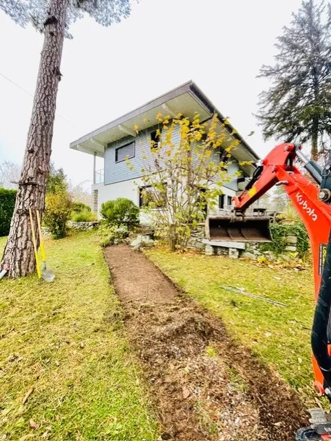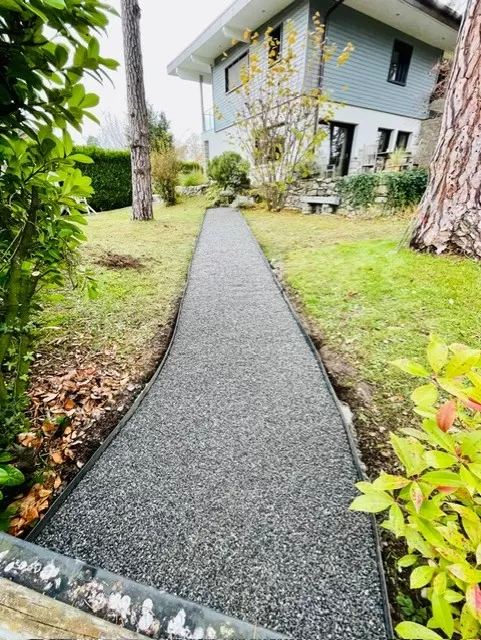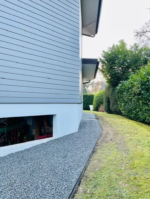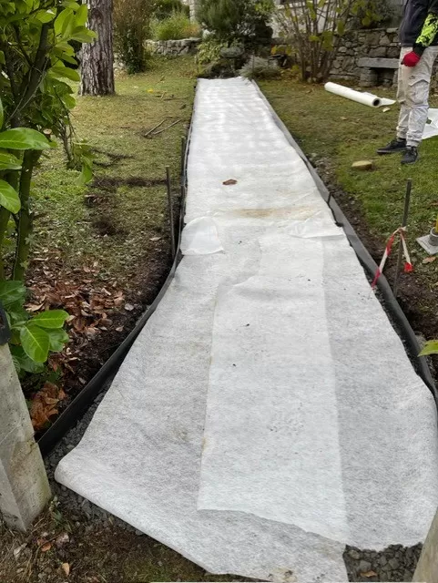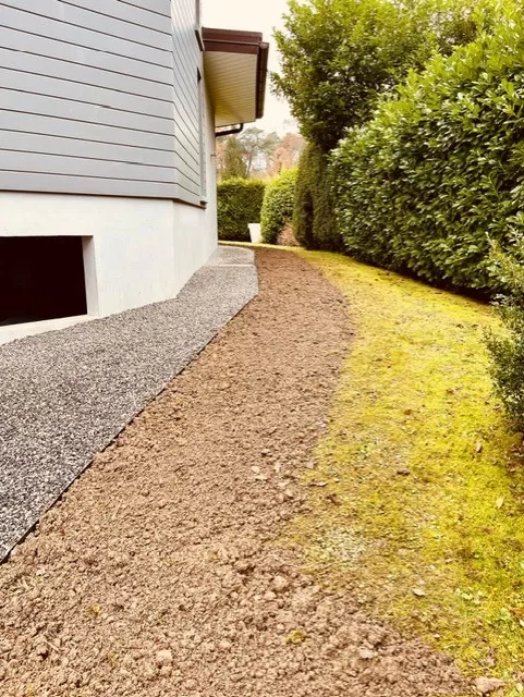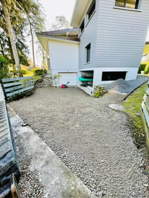 Terrassement, création de chemin d'accès piéton, terrassement de la cour tintégrale d'une maison privée à Sciez. Mise en place du géotextile pour renforcer la stabilité, finition en gravillons.