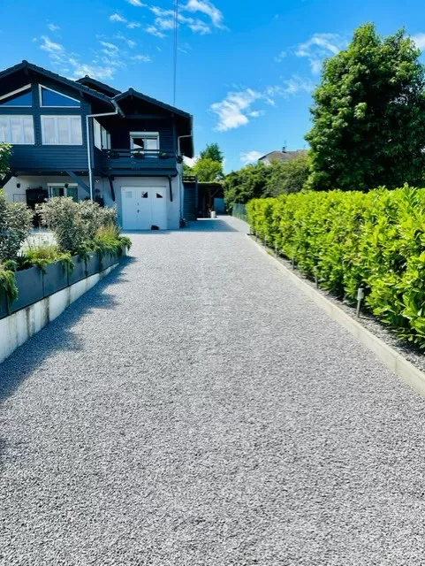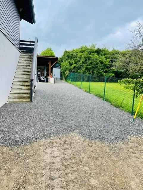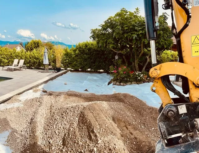 Terrassement d'une cour chez un particulier à EXCENEVEX. Terrassement, geotextile, remblaiement, compactage et finition gravillons.