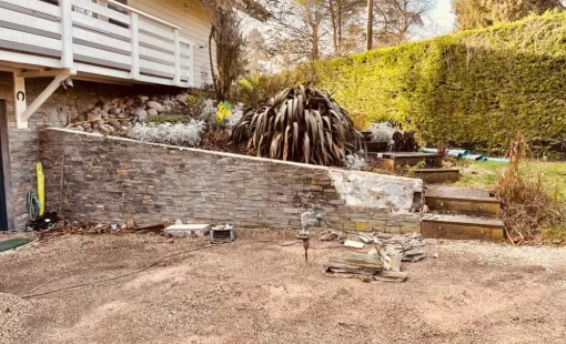 Démolition du mur en pierre avec terrassement + préparation du sol pour la mise en place d'un mur en gabion à Sciez au domaine du coudrée.…
